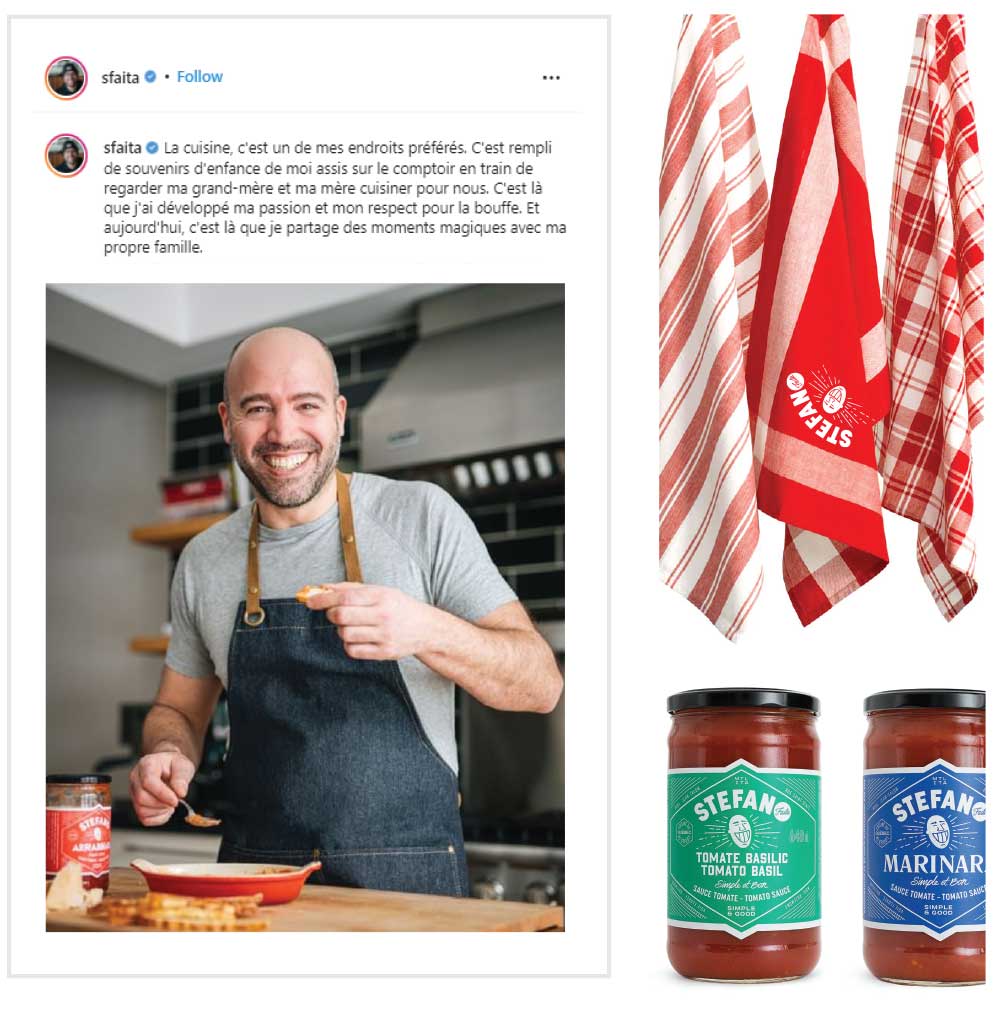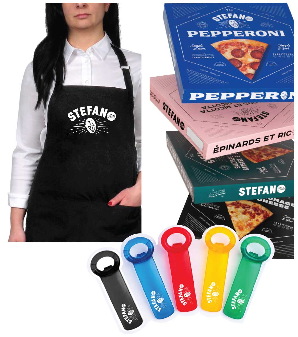 Stefano Faita is so confident in his products’ quality that he has his name and face printed on all of their packaging. Frozen pizza, dry pasta, tomato sauce and hazelnut spread are hardly groundbreaking products, but Stefano’s authentic recipes and quality ingredients have made his brand a Canadian favourite. This attention to detail extends to every aspect of the company’s presentation, all the way to the promotional items and the custom apparel Stefano wears to the brand’s many brand activations and events.