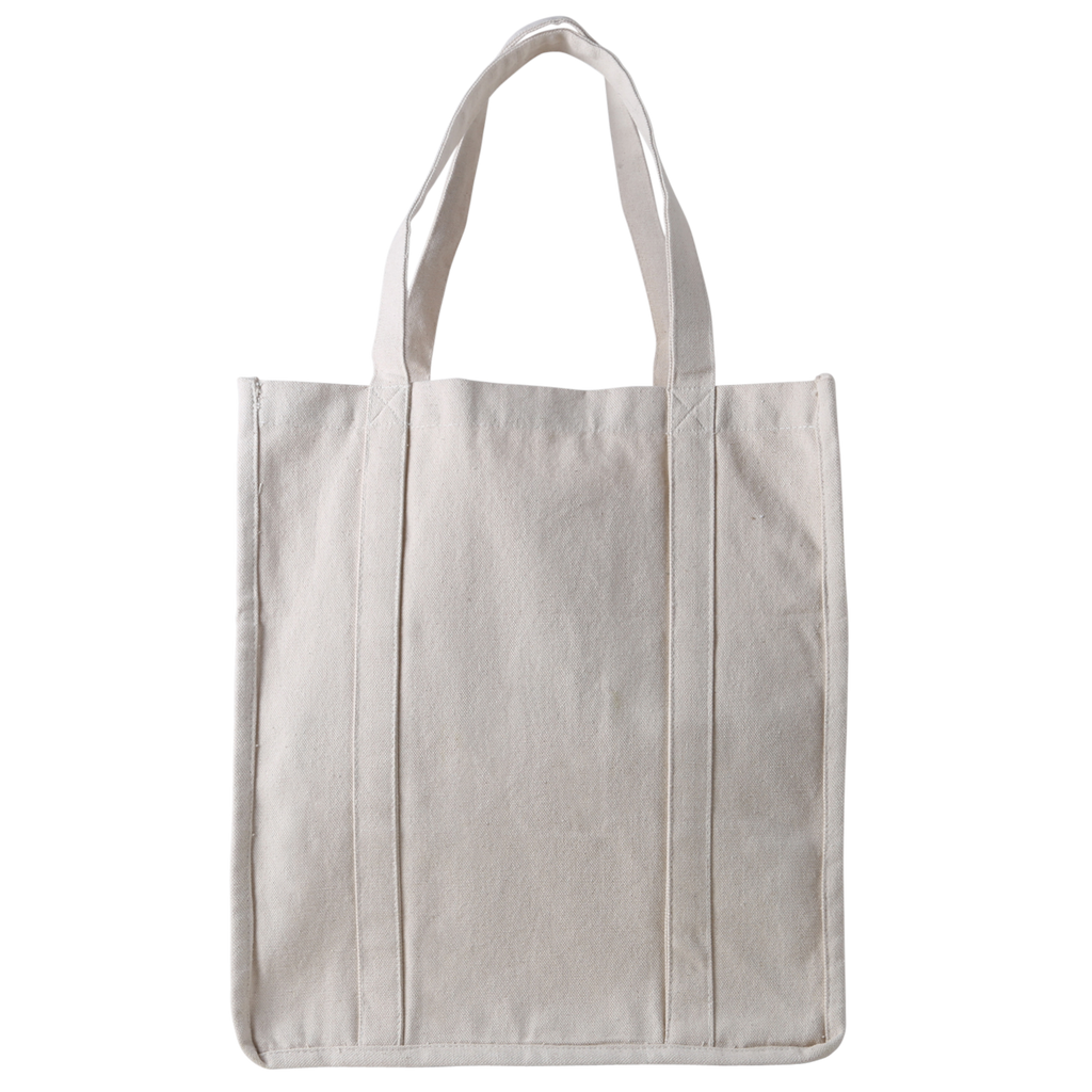 We've revamped a popular style into a durable, functional 12 oz. Jumbo cotton tote that promises a lifetime of use. Perfect for heavy grocery hauls with deep side gussets and a sturdy self-material bottom base, it can support even heavy items like soup cans. This eco-friendly tote replaces up to four standard plastic grocery bags, offering a sustainable alternative to reduce single-use plastics.