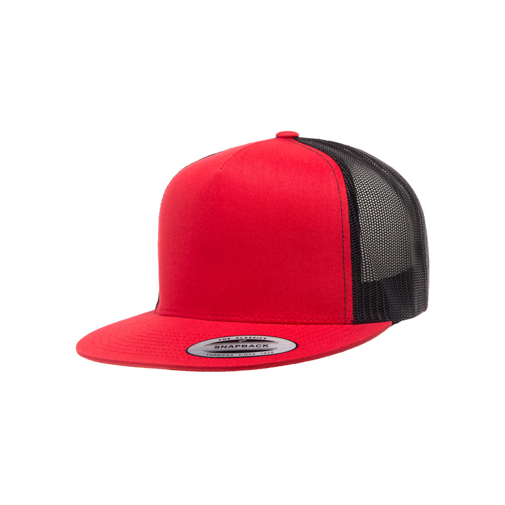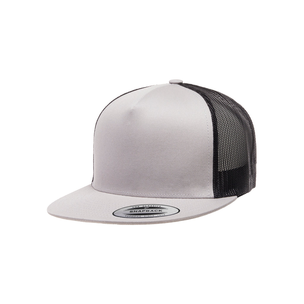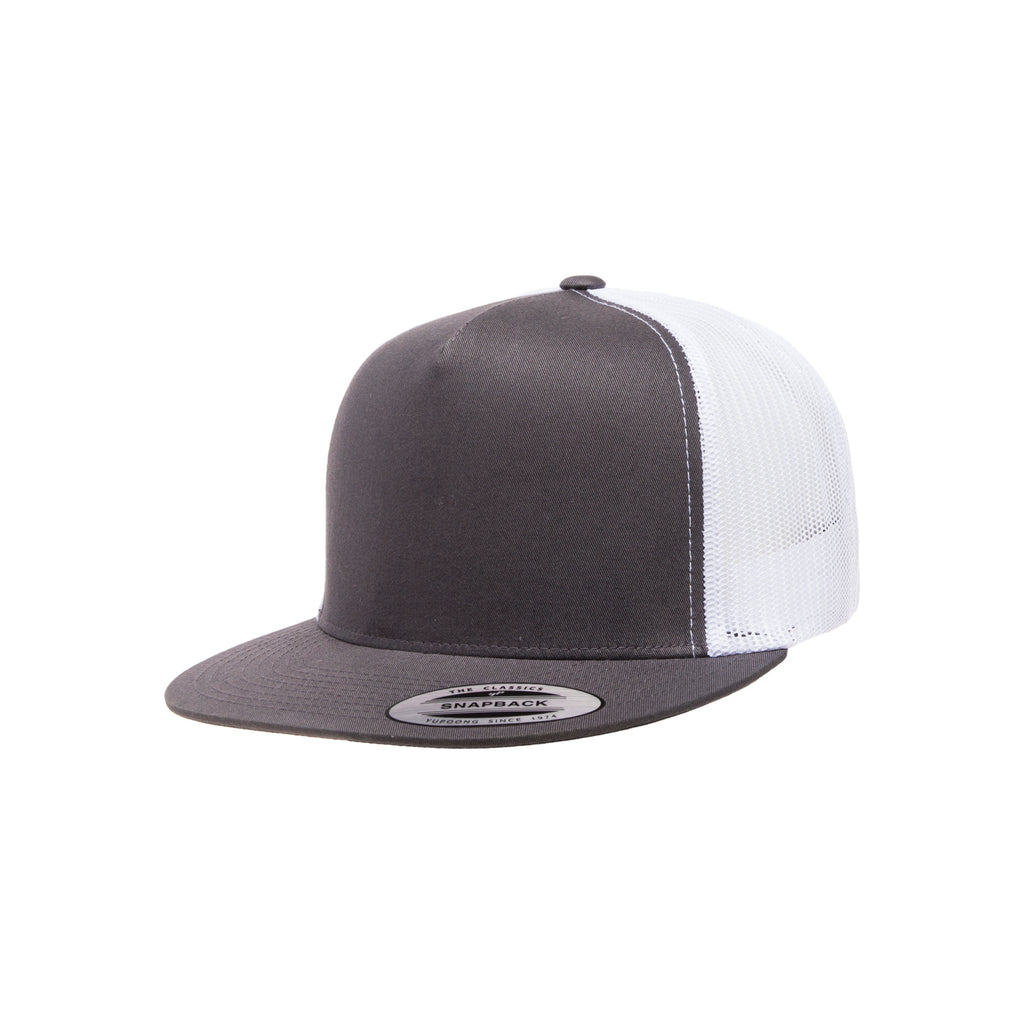 A fashionable update to the premium trucker cap with contrast color front, beak and top button, fully loaded with darted front panel as well as high profile and flat beak. Adjustable back plastic tab and mesh accents give it the original vintage feel. The darted front allows ample room for easy transfer print as well as embroidery.