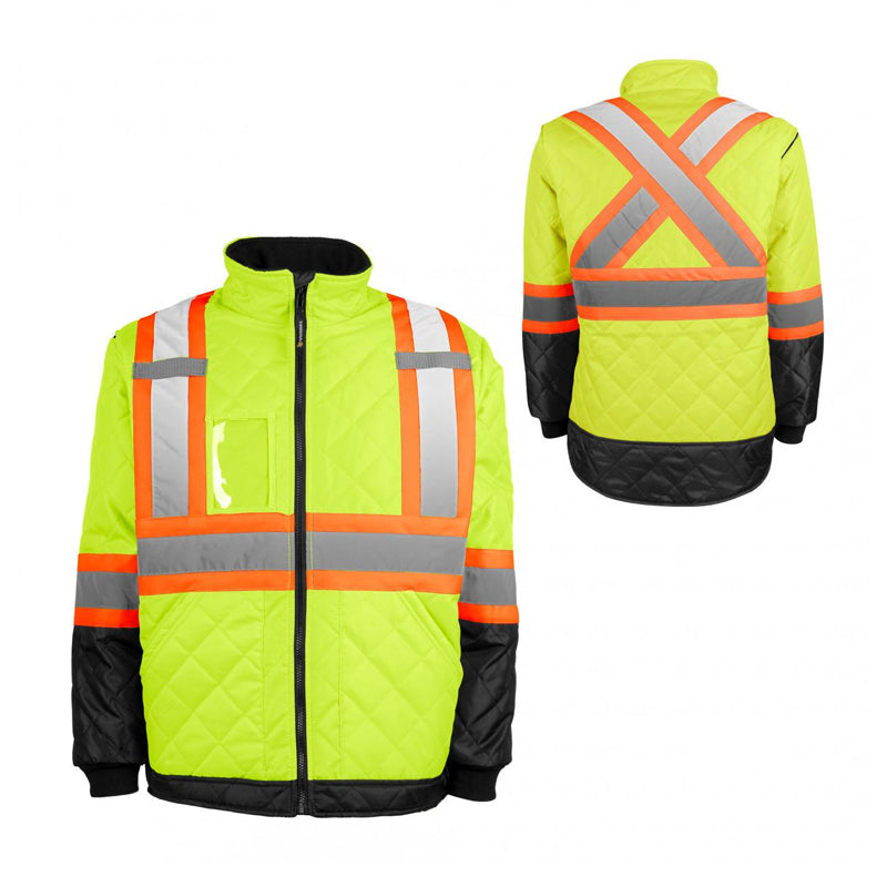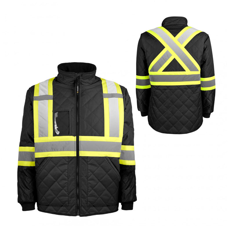This Hi-Vis Lined Jacket is designed for comfort and safety. Made with 150-deniers Oxford polyester with diamond quilting and a taffeta lining with a polyester insulation, this jacket delivers reliable warmth and protection. With reflective tape and a contrast stripe, it offers superior visibility. It also features a stand up collar with fleece lining, a knit gusset at the back of the shoulders, and a center zipper with a storm flap for added protection. Plus, it has microphone loops and an ID badge holder.