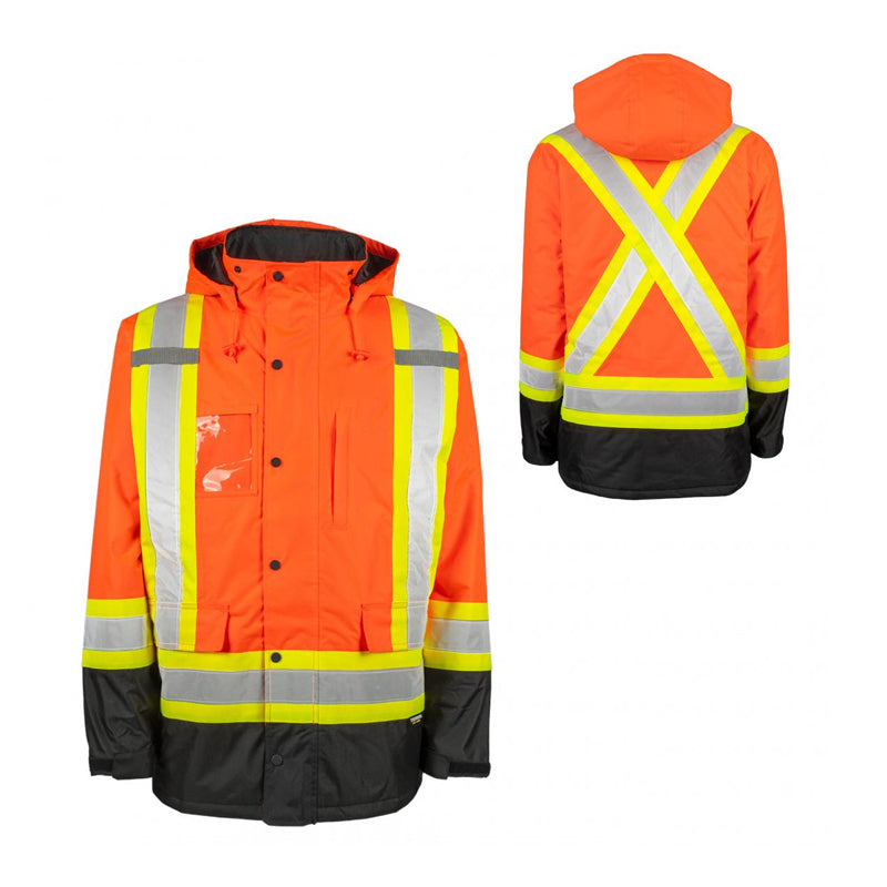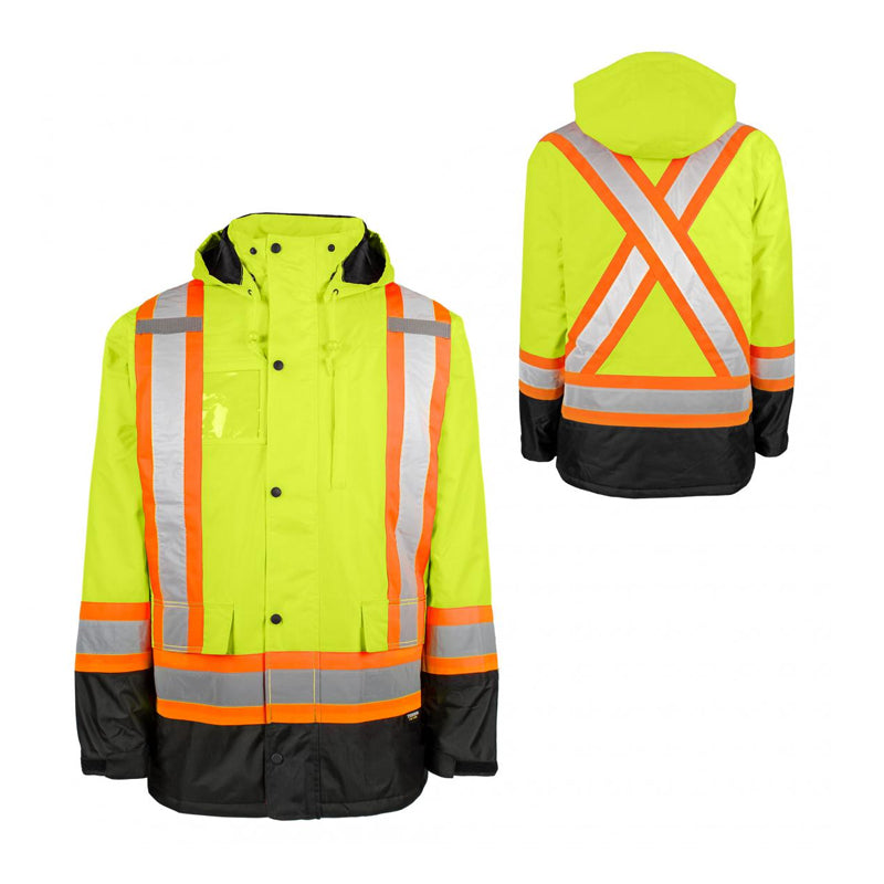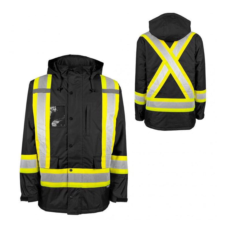 Stay safe and stylish in a Hi-Vis Parka. This 300-deniers polyester with PU coating is guaranteed to be durable and water-resistant, lined with diamond quilted polyester taffeta and polyfill insulation for warmth. Reflective tape and a contrast stripe provides visibility even in difficult lighting, while the detachable hood accommodates a hard hat and two rows of snaps for security. For convenience, the parka also includes a 2-way center zipper, storm flap, dual microphone loops, and an ID badge holder.