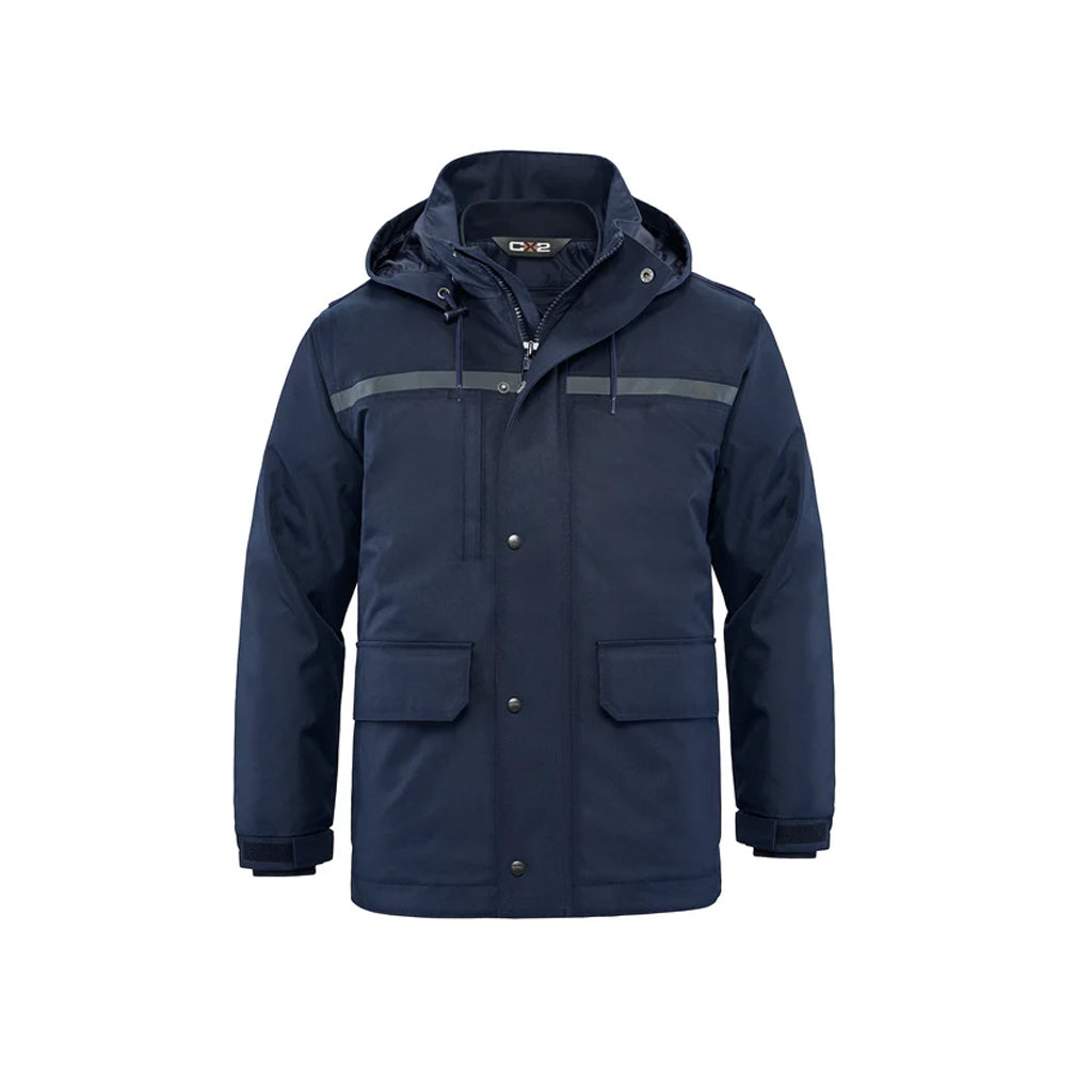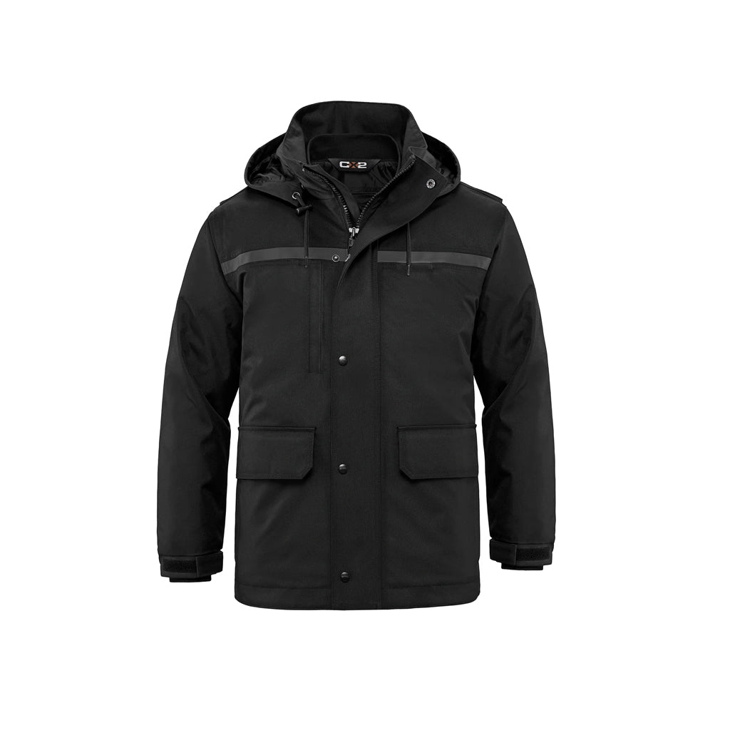 The Pinnacle - Heavy Duty 3 in 1 Parka w/ Detachable Hood features a 100% polyester oxford outer layer with wind resistance and a water-repellent finish. It includes a 100% polyester taffeta inner jacket with similar wind and water-resistant properties. The outer jacket is fully seam-sealed and has a waterproof, breathable coating.It has a snap-detachable, three-piece hood with an adjustable drawcord, and reflective trim on the shoulders. There is a slot on the left chest for a walkie-talkie or ID. The jacket features a two-way front zipper, a zippered chest pocket on the right, and double lower front pockets.