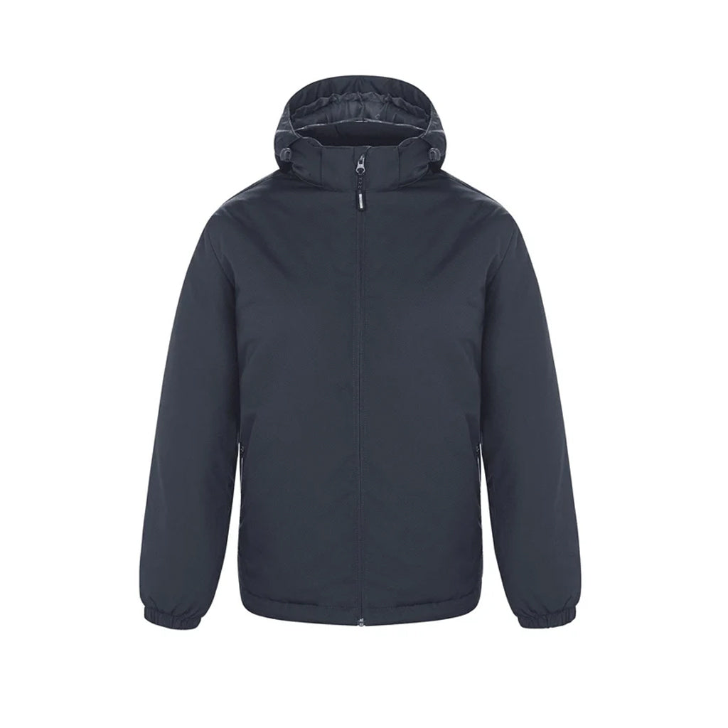 The Playmaker - Men's Insulated Jacket w/ Detachable Hood features a 115 gsm (3.4 oz./yd²) 100% polyester dobby fabric with a wind and water-resistant finish. It includes 170 gsm polyester insulation in the body and 130 gsm in the sleeves, with a polyester taffeta lining. The jacket has a detachable hood with a zipper, an inside fly front, reflective trim on the pockets, and adjustable drawcords in the hood and hem.