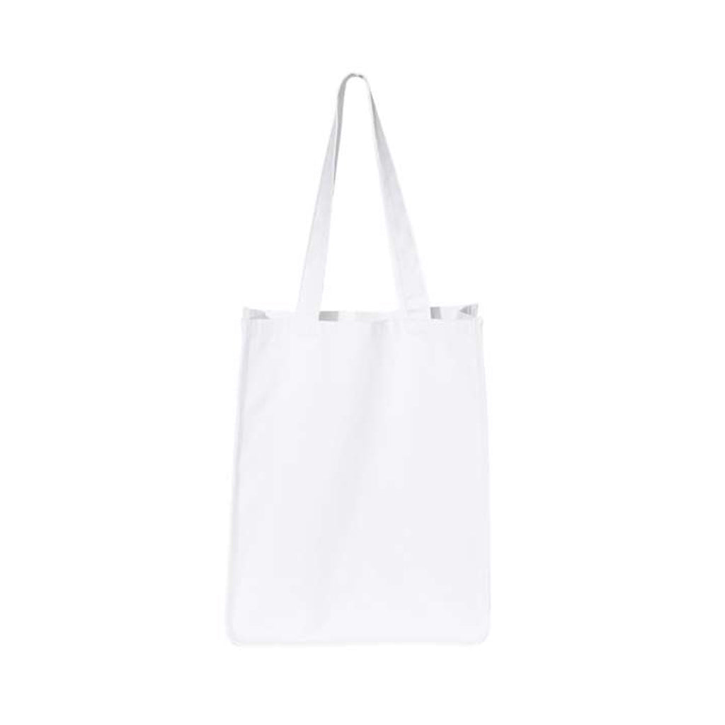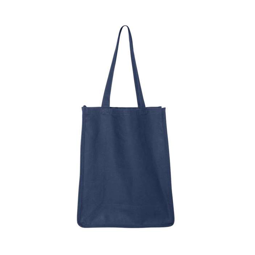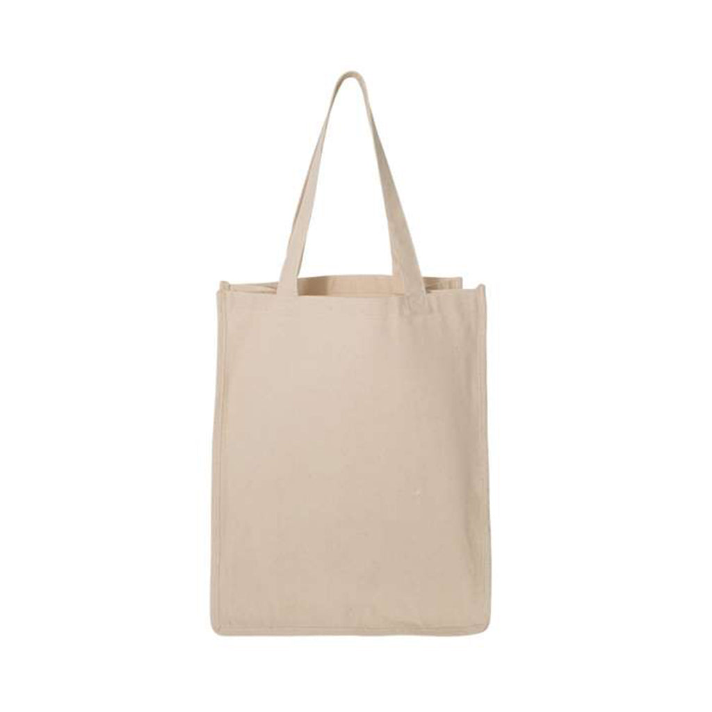 The Q-Tees - 27L Jumbo Shopping Bag is made from durable 12 oz./yd² (US) or 20 oz/L yd (CA) 100% heavy cotton canvas. It includes full side and bottom gussets, which enhance its capacity and stability. The tote features 24" self-fabric handles, providing ample length for comfortable carrying. With an 11" handle drop, it offers versatility and ease of use in various applications.
