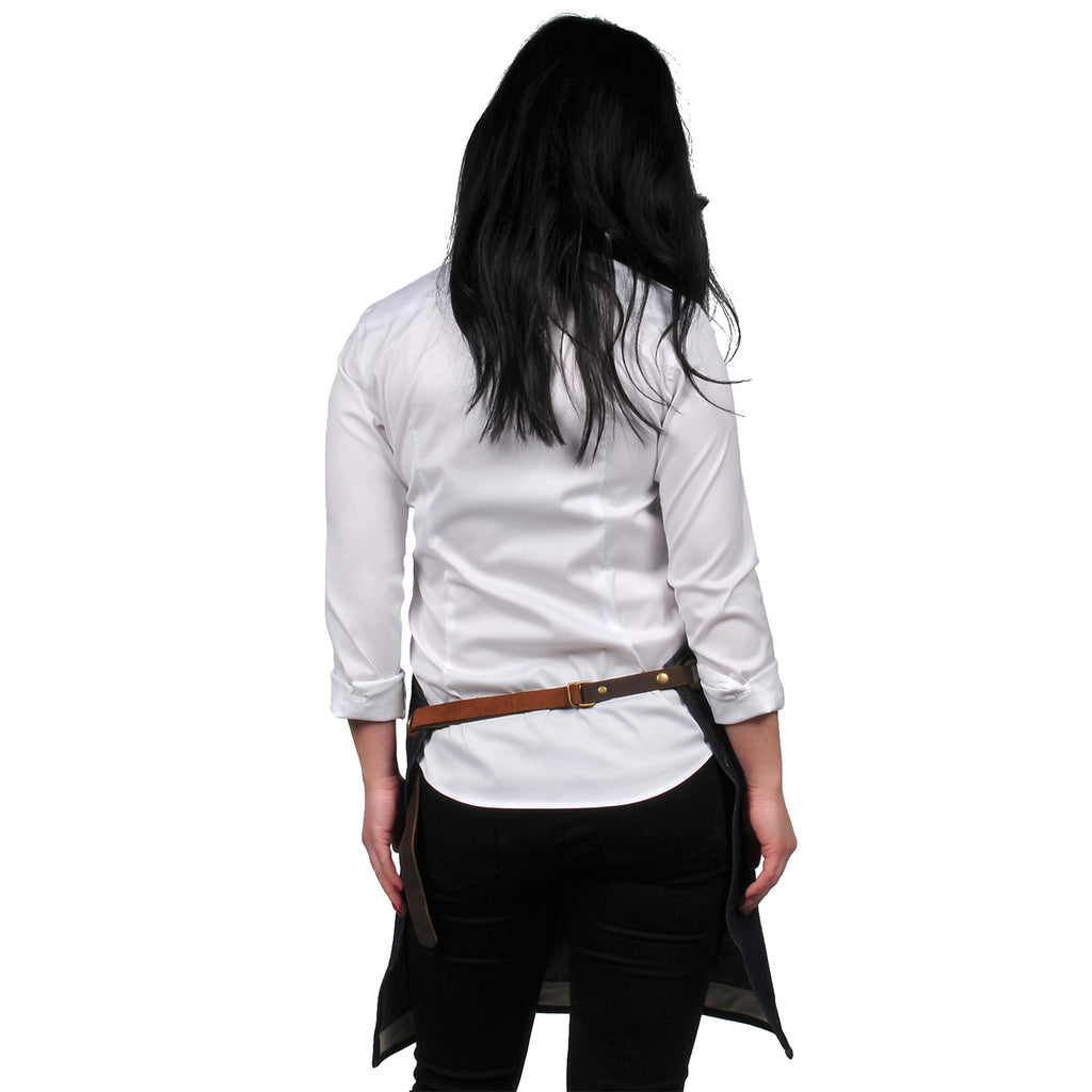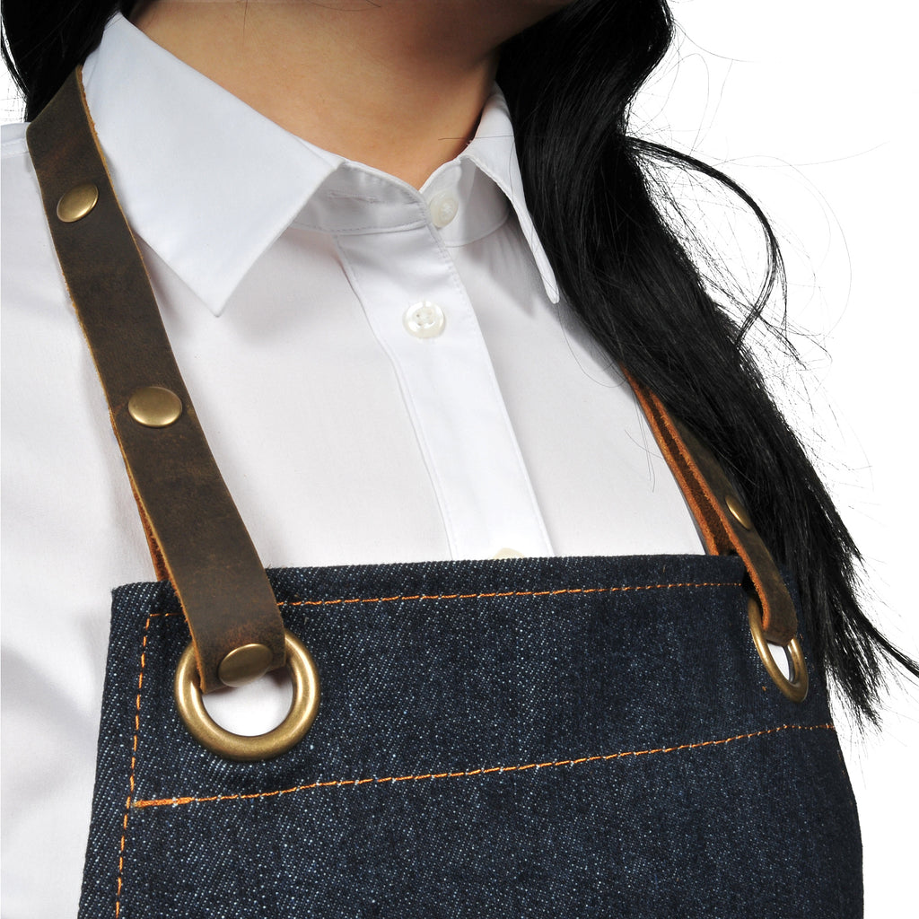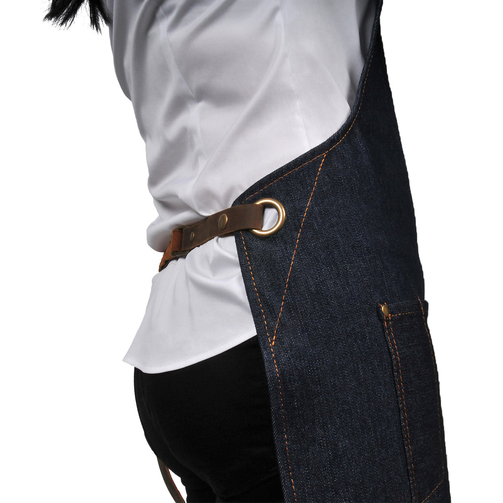 Oh so durable and oh so urban. The Wrangler is an extra trendy and quality dark denim apron with oversized grommet details. Genuine leather adjustable neck and waist straps with antique metal trims gives this much in demand bib apron a designer look that’ll surely match your uber-stylish resto interiors. The perfect complement to an urban, steakhouse or modern resto, your restaurant uniforms just got a serious upgrade with this must have!